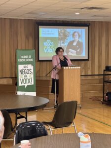 À gauche : Gabrielle Lemieux, présidente de l’AEFO, lors de la rencontre à St-Isidore; à droite : Darling Alexandre, membre de l’Unité 64, lors de la rencontre à Toronto.